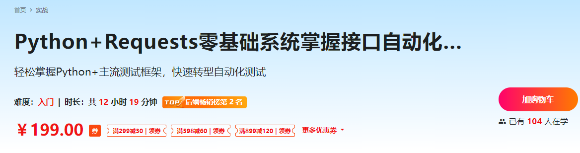 接口测试工程师越来越值钱,企业招聘需求旺盛,但网上的教程大多都比较零散,不系统。 本课程结合老师多年实战经验,手把手带你 从Python编程基础学起,首先让你具备自动化脚本编写能力,然后以实际项目驱动,带你快速提升主流测试框架Pytest+Requests+Allure整套接口自动化测试实战能力,最后融合老师多年面试官经验,助力你快速转型成为更具竞争力的Python自动化测试工程师。