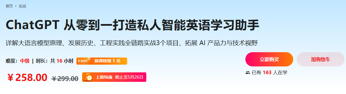 AI 的 iPhone 时刻已来,以 ChatGPT 为代表的大语言模型正在以极其迅速的节奏进入我们的生活,本课程从介绍 ChatGPT 模型的原理、发展历史,带领大家从浅入深,递进式的从零到一学习三个实战项目:私人 ChatGPT助理,智能英语学习助手,再到最后的进阶产品ChatBook,为你在新技术探索过程中提供更多灵感,增加职场竞争力。