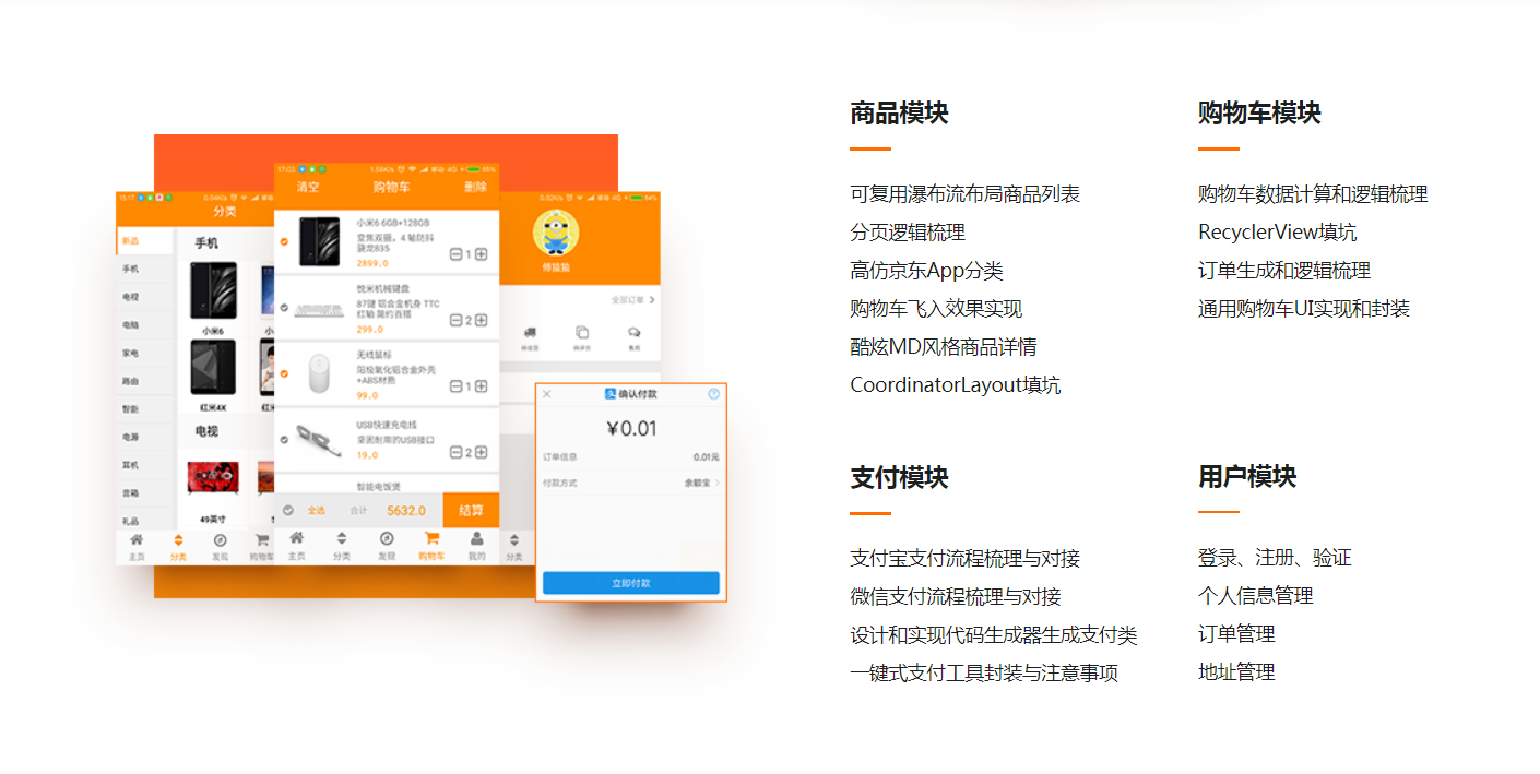 - 第13章 购物车,订单,支付功能开发(包含支付宝支付和微信支付)本章将带大家完成购物车UI的编写,对购物车内部选中,删除,清空以及结算的逻辑进行梳理,并梳理订单生成与第三方支付的逻辑,封装傻瓜式调用的支付工具并实现支付宝,微信的支付功能。
