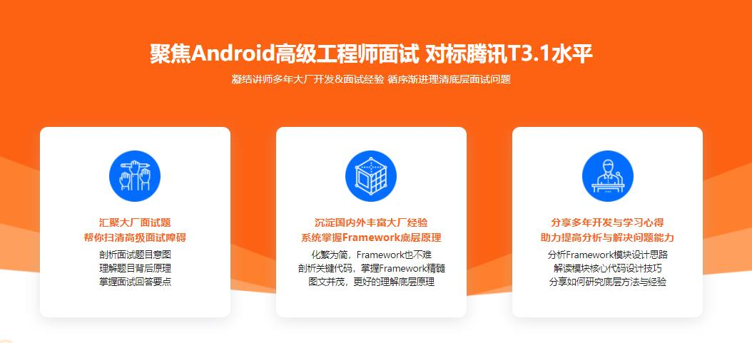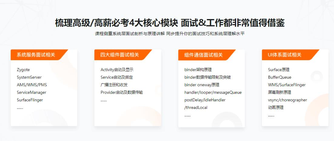 课程着重讲解Android系统底层原理,补齐Android开发的Framework层知识短板。一方面对高级工程师的面试提供直接帮助,另一方面可以提高大家的技术段位。兼顾面试知识技能与开发内功,适合每一位Android中高级开发者。