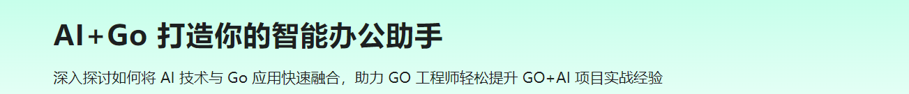 如果你希望将AI大模型技术融入 Go 项目提升开发效率,却找不到对 Go 开发者更友好的AI大模型学习资料,选这门课就对了,因为这门专为 Go 开发者量身定制。课程以“智能办公助手”项目驱动教学,首先带你夯实 AI 核心基础、大模型应用开发基础,然后为你深度剖析 LangchainGo 框架底层原理,在项目实战中循序渐进的拔高你的 AI 技能,让你拥有 AI +Go 高效开发新范式及完美融合的实战落地能力,最终达成 AI + GO 技术和实践经验的双重收获。
