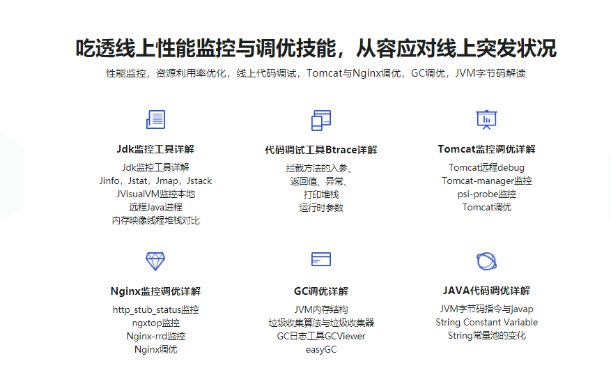 通过本课程,你将掌握多种性能监控工具应用,学会定位并解决诸如内存溢出、cpu负载飙高等问题;学会线上代码调试,Tomcat、Nginx,GC调优等手段;读懂JVM字节码指令,分析源码背后原理,提升应对线上突发状况的能力。