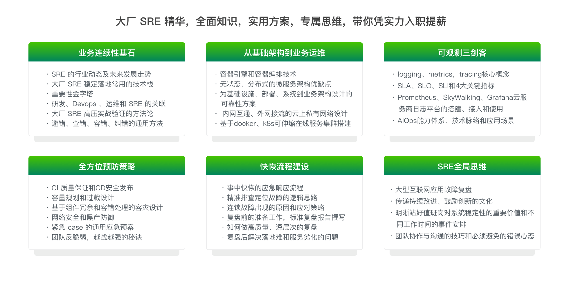 SRE,网站可靠性工程师,相较于传统运维,SRE 更注重用软件工程的思维来提高服务的性能、稳定性和扩展性,薪资更高,职业空间更大,是毕业生求职,研发、测试、运维工程师突破职场困境的蓝海岗位。本课程由资深 SRE 专家亲授,以故障事件管理为核心,带你系统构建实用知识体系;收获大厂级可复用的服务保障方案【覆盖监控、容量规划、故障处理、自动化运维及性能优化等关键领域】;打通硬技能的同时,更倍增全局可靠性思维的软技能 ,助你快人一步驶入提升核心竞争力的快车道。