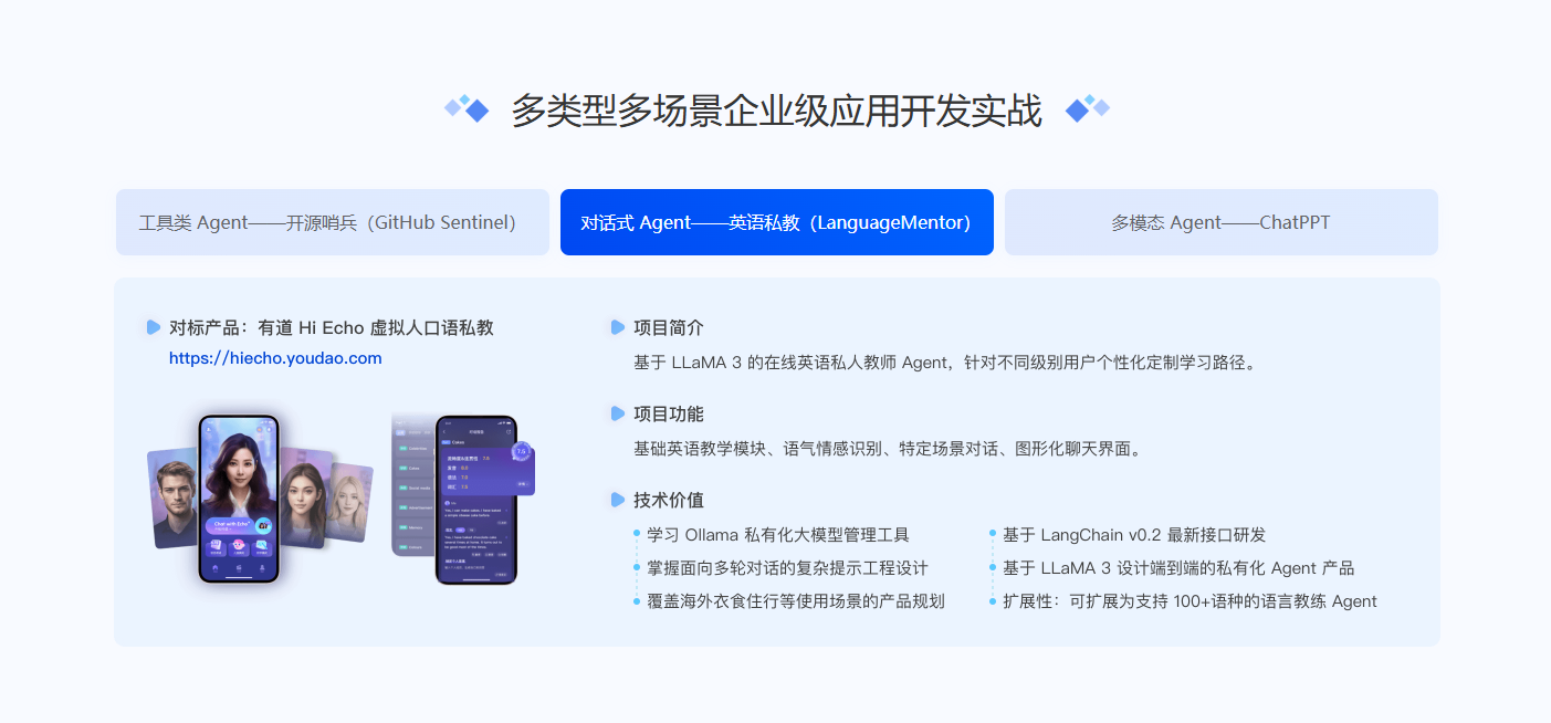 极客企业级Agents开发实战营视频教程。AI Agent不仅仅是工具,它具备自主性、反应性和交互性,能够通过独立思考和调用工具来逐步完成给定目标。这使得它的应用方向和领域非常广泛。本课带你一站式掌握企业级Agents从设计、开发到部署全流程,工具、对话及多模态等不同类型Agents的工程化开发实战,生产级私有化大模型部署、管理、调优实践,最新版本Ollama、LangChain系列工具上手实战。