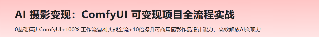 AI 摄影变现:ComfyUI 可变现项目全流程实战。ComfyUI凭借其细致的图像控制、超快的出图速度、极低的性能要求,一举成为商业落地应用的首选,但学习门槛较高,常常让人望而却步,不敢尝试。本课程由具有多年comfyUI商业化落地经验的忠彬老师,带你高效掌握一套能满足不同业务场景的AI摄影真实可落地的解决方案,一栈式学习:本地&云端安装、正负提示词、ControlNet模型、云端工作流等ComfyUI核心技能及生态体系。并从0到1完成10+商业级落地应用项目(本地及云端双线),让你少走弯路,高效解放AI生产力。