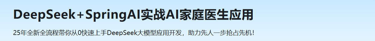 DeepSeek驱动Agent开发需求量暴增,人才缺口大。如何快速掌握DeepSeek开发AI应用,是先人一步,抢占AI红利的关键。为此,推出首门DeepSeek与SpringAI课程。从零开始,打造一款AI家庭医生,涵盖健康咨询、病历分析核心模块开发,实现AI与应用对接。此外,可根据创意拓展和升级为个人毕设,面试项目,商业变现(AI女友、养老机器人、医疗助手等),丰富AI项目实战经验,成为真正能把DeepSeek技术落地的开发者!