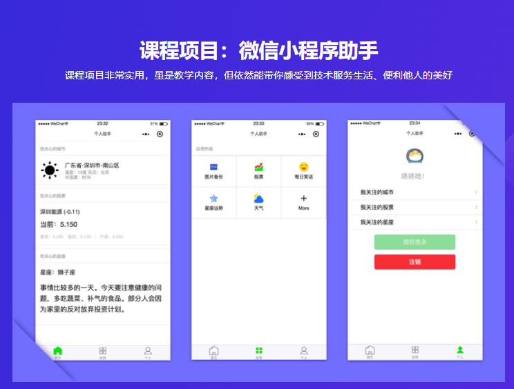 从几个方面介绍小程序开发相关的内容,包括小程序开发者账号注册、小程序开发流程、小程序开发规范、小程序常用的API,例如网络请求、本地缓存等API,以及小程序组件等等的知识点。