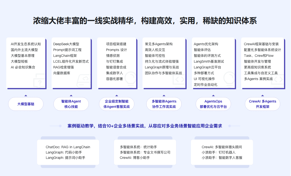 AI Agent 开发已是AI时代的关键技能,市场需求旺盛,人才紧缺。越早掌握,未来收益越大!本课从基础出发,手把手带你逐步深入,覆盖从需求分析到设计、开发、部署优化及评估的全流程。你将掌握全栈技能(LangChain、CrewAI、Deepseek、RAG、单/多Agent及工作流等)。积累10+多场景实战经验;具备智能化解决方案设计能力;全方位提升企业定制化、智能化开发综合实战能力,助力成为AI时代市场紧缺、枪手人才。
