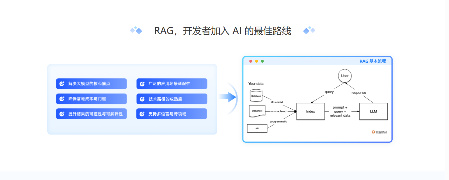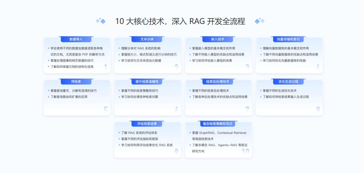 深入RAG工程核心技术:涵盖数据导入、文本分块、嵌入、向量存储与索引、复杂检索等关键技术。