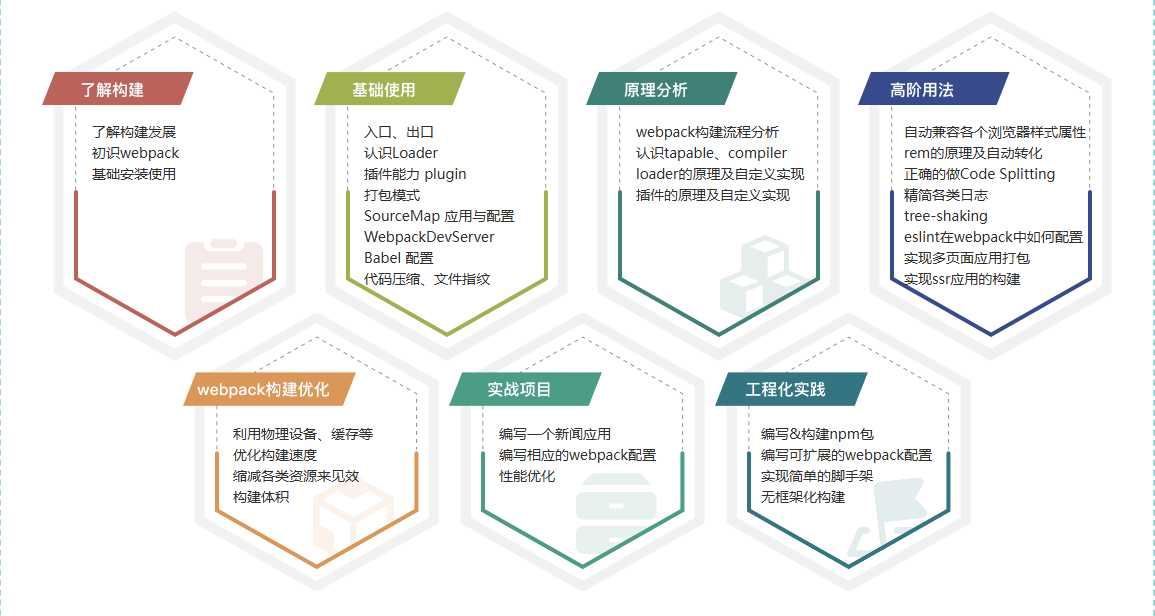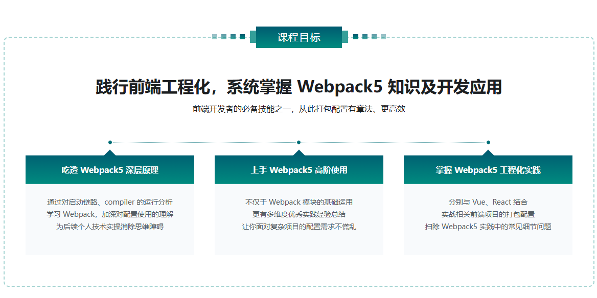 Webpack5 入门与实战,前端开发必备技能视频教程。Webpack 作为一款可以提升开发效率、提高页面性能的工具,是前端开发者必备的技能。不过现实中还有很多前端同学对 Webpack的使用局限在调用阶段,对于其内部原理以及已有的配置不够了解,无法高效用好这个工具。本课程将通过一系列由浅入深的内容设计,帮助大家提升对 Webpack 的理解,并且能在实际业务中加以应用。