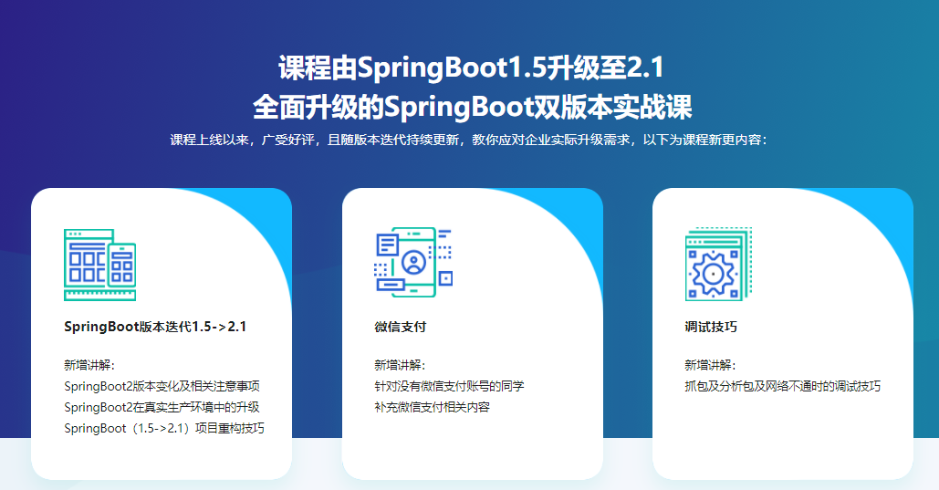 课程上线以来,广受好评,而讲师对同学的关心也在持续,因此特别带来本项目的随版本迭代更新内容,教你应对企业实际升级需求,让你紧随技术潮流,做到持续进步,成为独当一面的工程师。主要涵盖以下内容: SpringBoot2版本变化及相关注意事项 SpringBoot2在真实生产环境中的升级 SpringBoot(1.5->2.1)项目重构技巧 针…