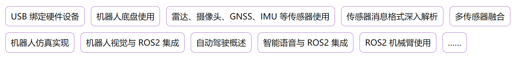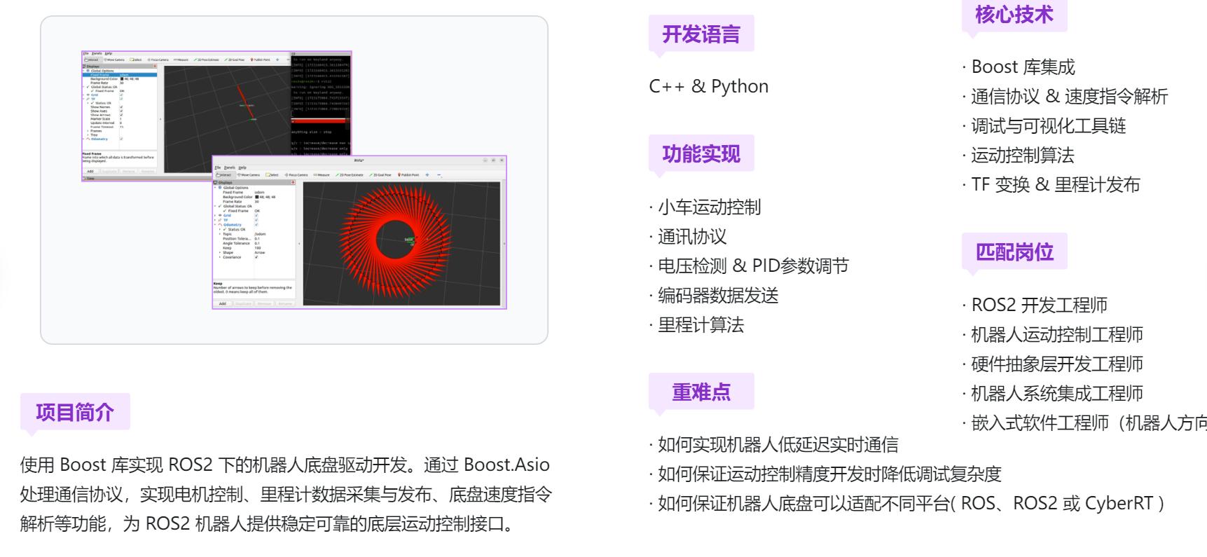 3、打通机器人仿真到实体,ROS2机器人运动控制:熟悉 ROS2 在机器人上的实际应用操作,能够独立完成机器人的硬件连接、传感器配置、基于 ROS2 实现机器人基本动作控制,具备初步的机器人实操能力。