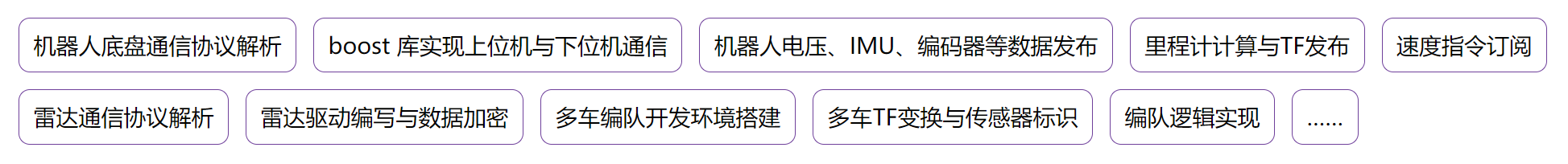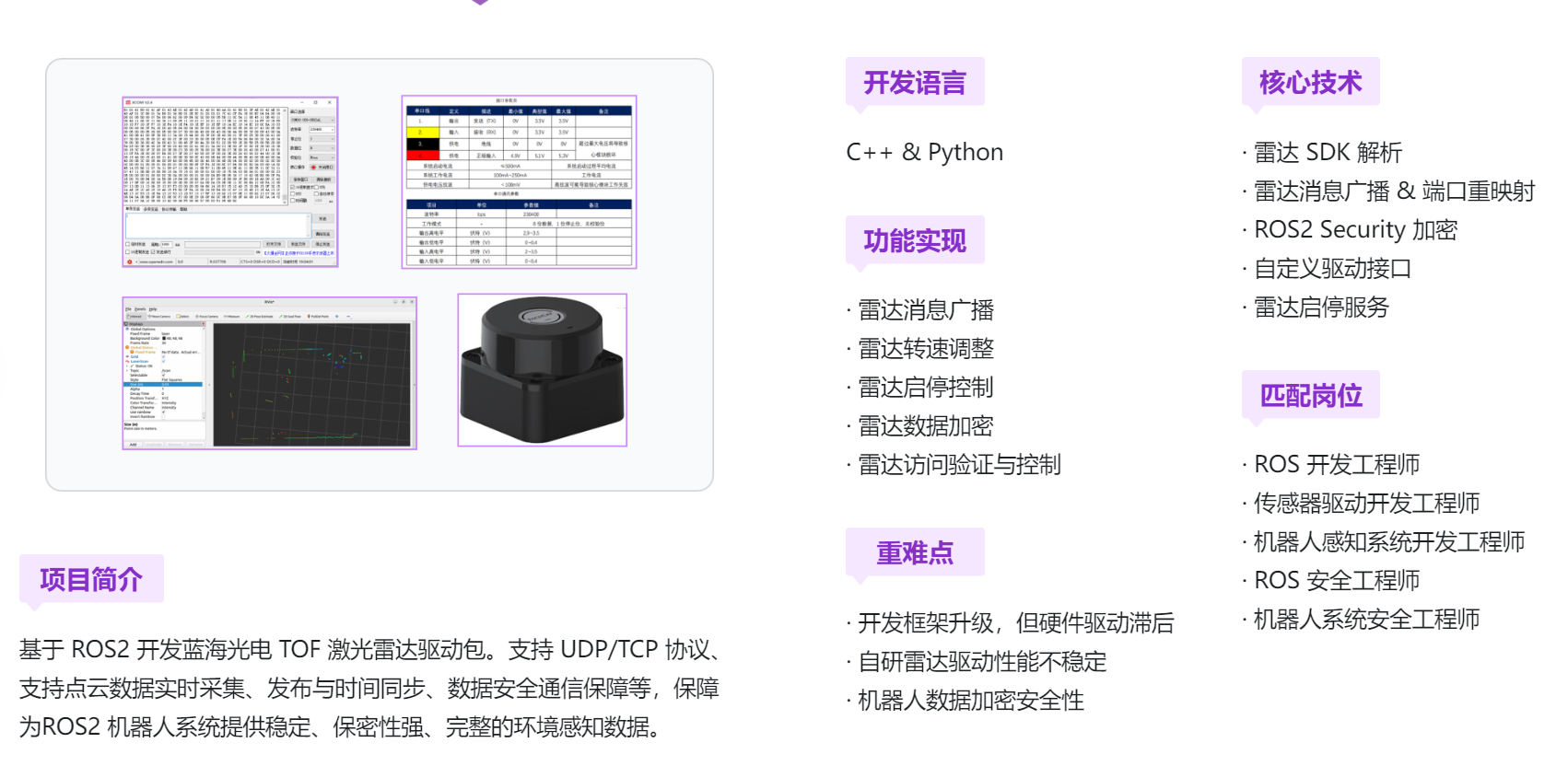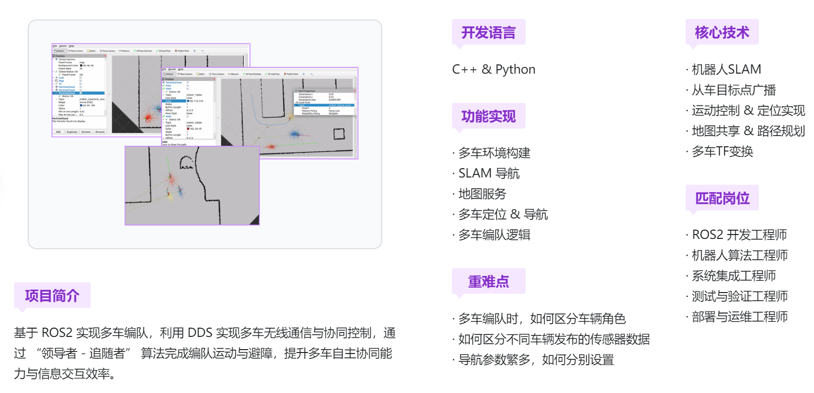 6、打造专属机器人解决方案,ROS2 生产级项目实战:主导完成机器人项目全流程开发( 需求分析-算法优化-部署运维 ),输出可商用解决方案文档与代码仓库,达成工程师到开发者的角色跃迁。