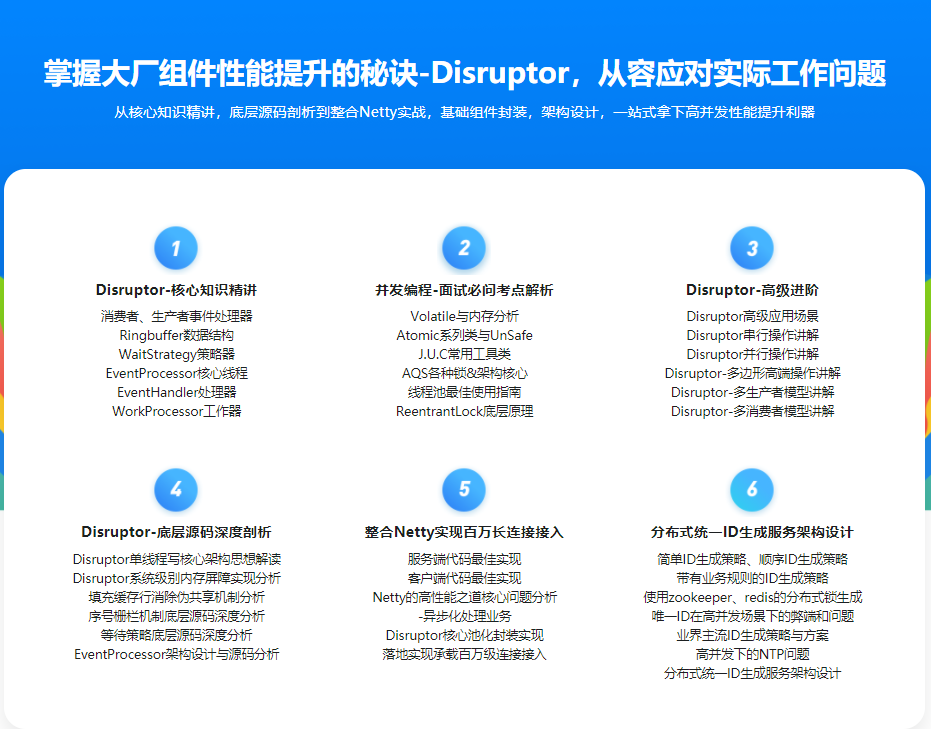 本课程从高性能并发结构Disruptor核心知识开始学习,之后带你深度剖析底层源码,整合Netty实战,最终进行架构设计,带你完全精通一个如此优异的开源结构,让你无论是应对实际工作、仍是面试晋升,都能游刃有余。