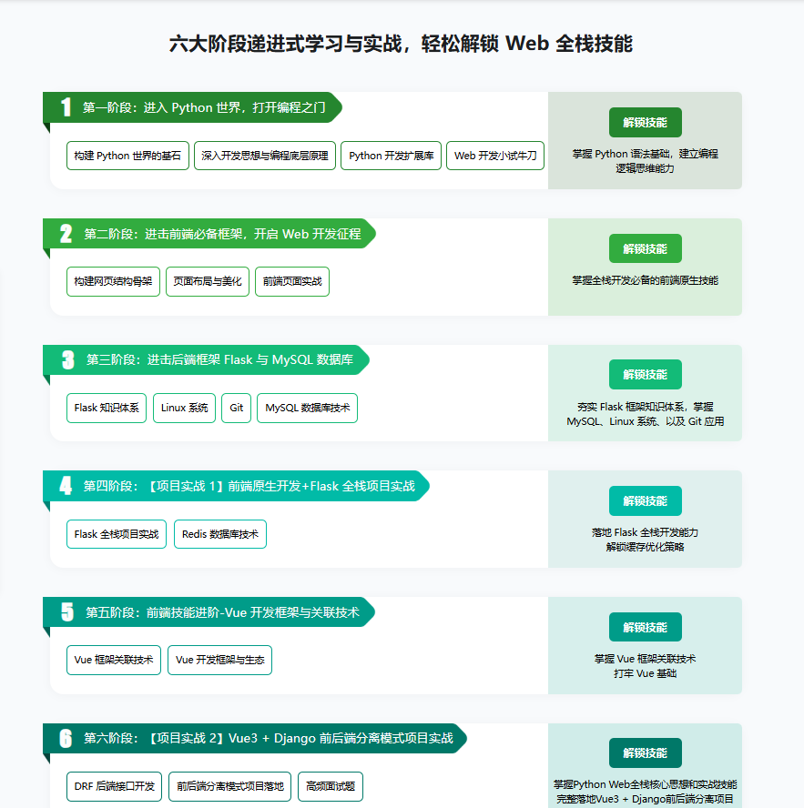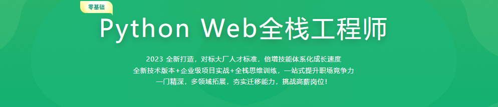 Python Web全栈工程师视频教程。本课完全对标大厂人才标准,2023 全新打造,全面讲解Python Web全栈工程师体系化知识,全新技术版本+企业级项目实战+全栈思维训练,一站式提升职场竞争力一门精深,多领域拓展,夯实迁移能力,挑战高薪岗位!