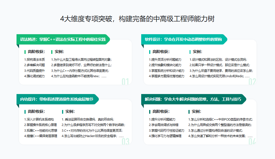 C++中高级工程师视频教程,本课带你4大维度专项突破,构建完备的中高级工程师能力树,语法精进:掌握C++语法在实际工程中的最佳实践;软件设计:学会在开发中动态调整软件的架构;内功提升:带你看透理清操作系统底层细节;解决问题:学会大牛解决问题的思维,方法,工具与技巧;围绕多个实战项目,多维度阶梯式提升,助力成为兼具 “内功,思维,设计,技术”的综合人才。