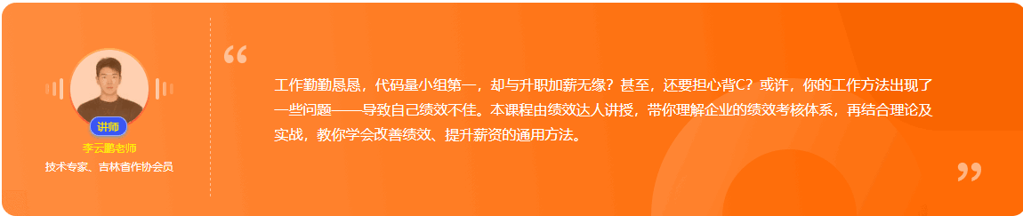 面向绩效编程,程序员的向上管理法视频课程,由乐学编程课堂网精心整理发布高清完整版。学会“面向绩效编程”,掌握职场发展的另一维度硬实力,看清绩效考核本质,了解绩效考核体系,理清程序员岗位的考核维度,真正具有实践效用的成型方法论,学完即用,持续提升你的绩效。
