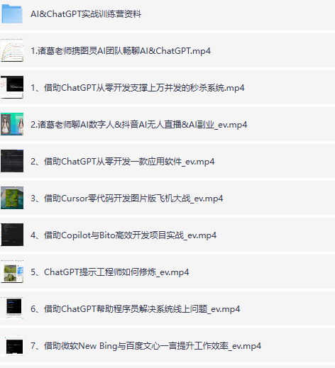 课程包含ChatGPT开发应用(秒杀系统、软件搭建、API开发)、AI编程助手(Cursor、Copilot、Bito)、AI办公(PPT/Word/Excel)、内容生成(短视频、文案写作)、AI绘画(Stable Diffusion、Midjourney)、数字人技术及插件开发,帮助学员快速掌握AI工具提升工作效率并探索副业机会。