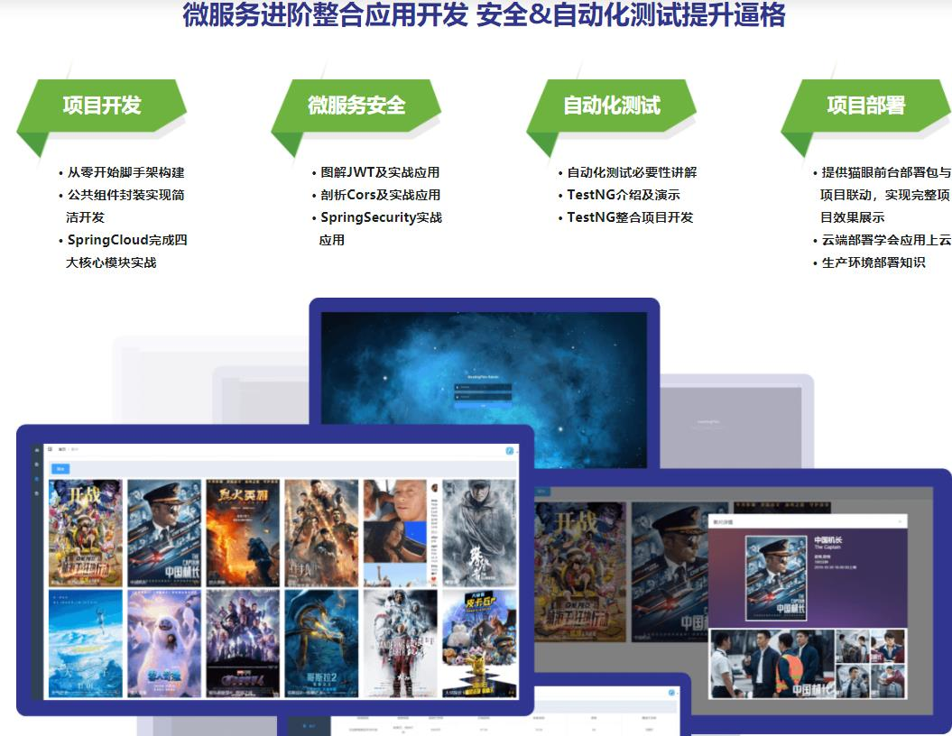 仿猫眼项目分为前台和后台两部分工程,可以演示一个购票网站从影片、影院维护到查看购买的整个流程。同时,为了方便学员可以构建出一个完整的项目,本章节会演示前台和后台两部分工程的安装部署以及演示。