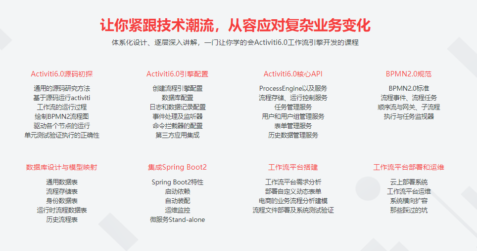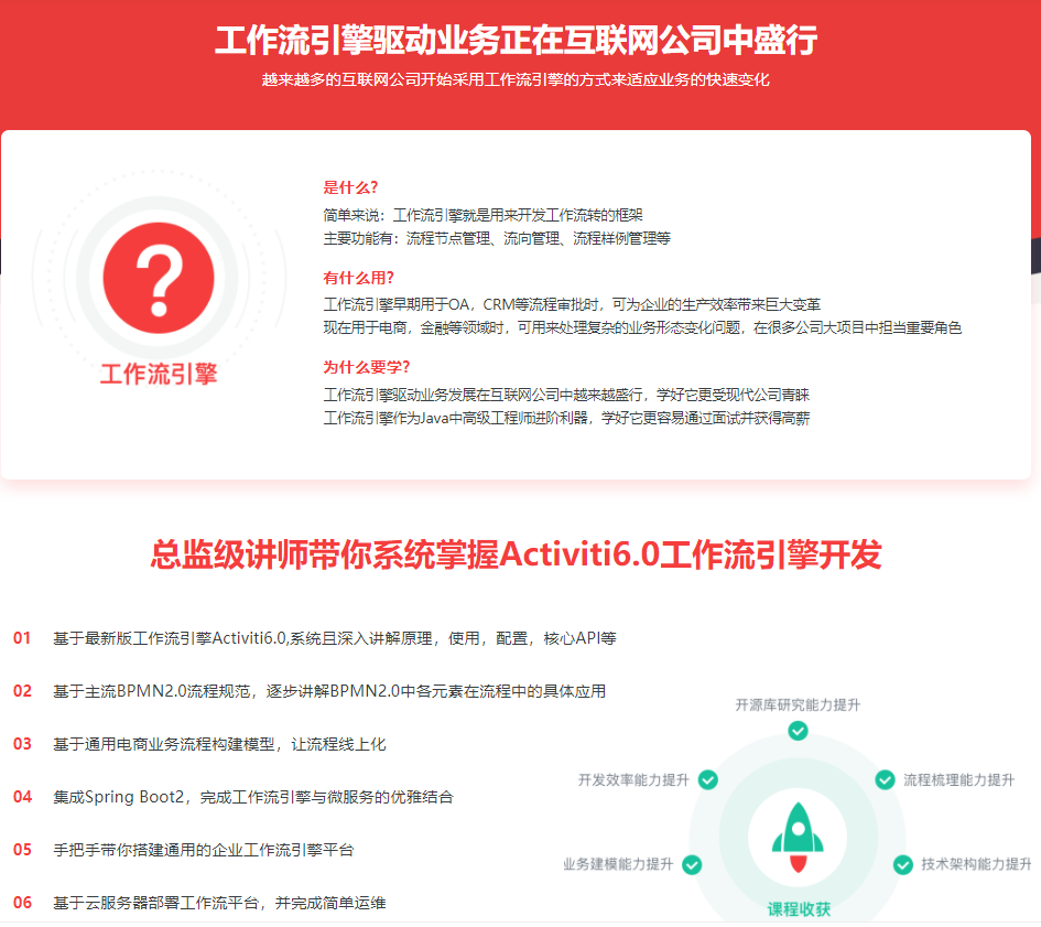 本课程将体系且深入源码解说Activiti6.0作业流引擎的运用、装备、核心api以及BPMN2.0标准、数据库规划及模型映射,Spring Boot2.0集成,作业流渠道建立、布置与运维等,经过本课程的学习,你将切实学会Activiti6.0作业流引擎开发,大大提高自己的事务建模才能,技能架构才能,开源库研讨才能,流程整理才能,然后进阶为Jav…