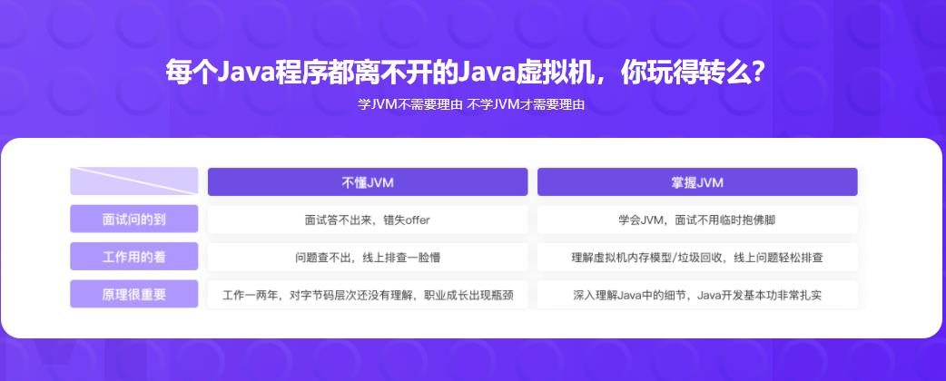 本课程从源码到运行、类加载,再到内存分配和垃圾回收,以及JVM调优的技巧与实战。整个课程基于JDK13讲解,理论-实战-面试三结合,带你剖析整个JVM知识体系,一站解决JVM问题。