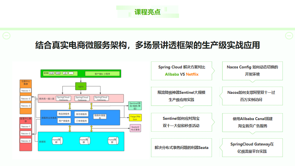 聚焦Spring Cloud Alibaba,深入剖析5大核心组件原理,并结合真实电商微服务架构,讲透框架在多场景下的最佳实践,助力全面提升微服务实战能力,轻松应对微服务领域的各种技术难题。