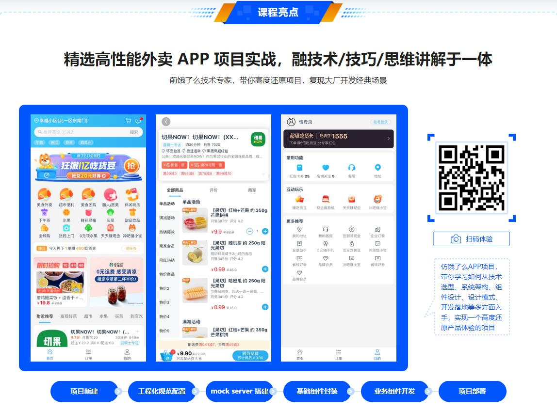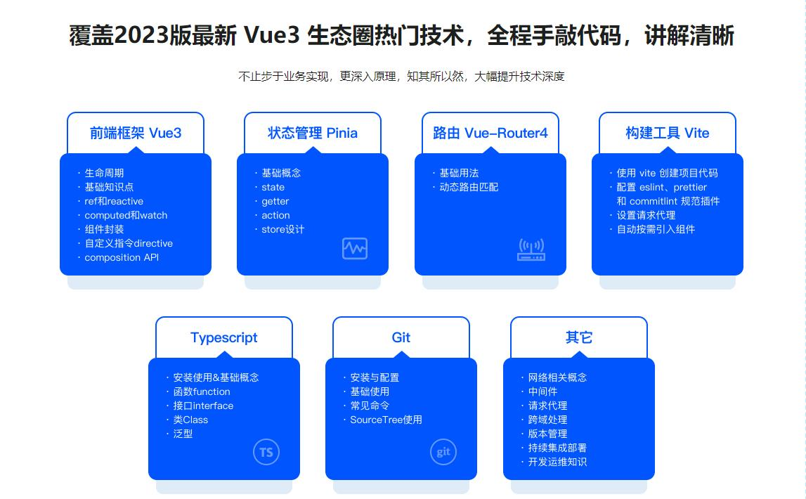 - Vue3 带来的改变,除了其自身新特性,还有相应的技术栈变化——比如 Pinia 将逐渐替代 Vuex 。本课程将带领大家使用 Vue3.2 + Pinia+ Vite + TS 高仿饿了么 Web App,帮助大家掌握 Vue3“全家桶”技术栈的同时,还掌握前端性能优化的常用方法和巧用设计模式应对复杂应用场景的能力。