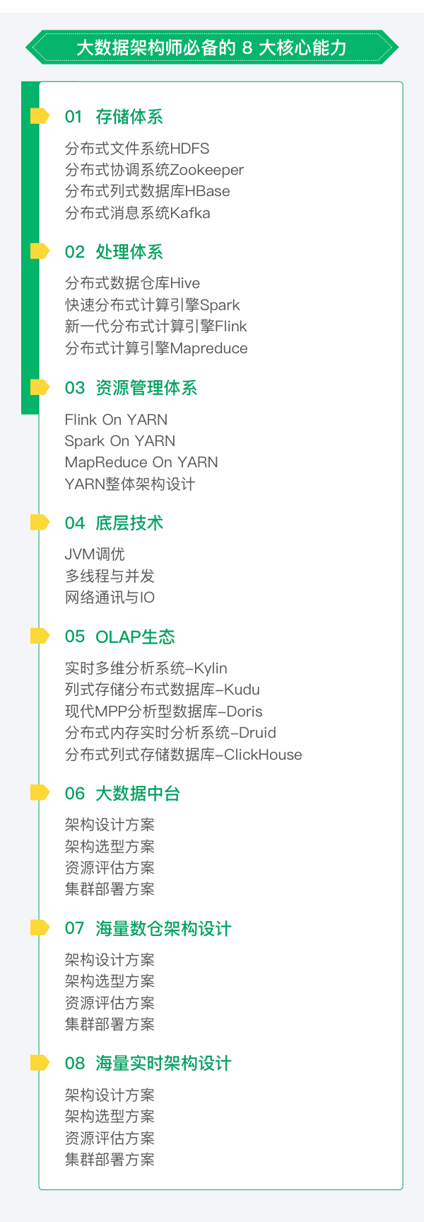 - 《大数据架构师》课程深度剖析了各个基础技术的源码,对这些基础技术知识动态的排列组合,形成大数据全局架构观,并深入讲述大数据全局架构设计的方方面面,打造真正满足企业万亿级海量数据规模的数据中台,真正赋能前台业务。同时,在企业万亿级真实项目落地环节,采用高性能、高可用、高扩展的架构设计原则,技术上更是融合了企业级主流的离线架构和实时架构,带领大家构建PB级的大数据中台,真正落地“企业千亿级的数据仓库中台”,实现“企业级数据中心平台”,搞定“企业千亿级广告统一数据流智能分析平台”,掌握“企业级Hadoop平台全方位二次源码开发”,让学员面对企业各种海量复杂业务场景,给出优雅的大数据架构设计方案。
