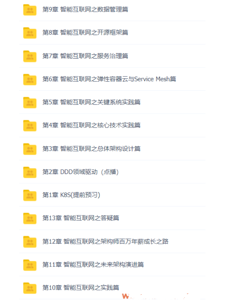 第13章 智能互联网之答疑篇 第1章 K8S(提前预习 第2章 DDD领域驱动(点播) 第3章 智能互联网之总体架构设计篇 第4章 智能互联网之核心技术实践篇 第5章 智能互联网之关键系统实践篇 第6章 智能互联网之弹性容器云与Service Mesh篇 第7章 智能互联网之服务治理篇 第8章 智能互联网之开源框架篇 第9章 智能互联网之数据管理篇 第10章 智能互联网之实践篇 第11章 智能互联网之未来架构演进篇