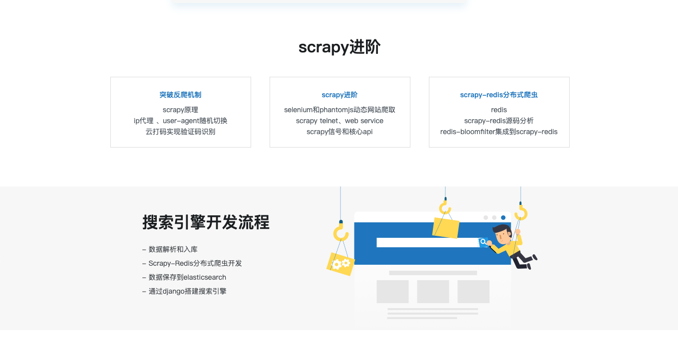 搭建scrapy的开发环境,本章介绍scrapy的常用命令以及工程目录结构分析,本章中也会详细的讲解xpath和css选择器的使用。然后通过scrapy提供的spider完成所有文章的爬取。然后详细讲解item以及item loader方式完成具体字段的提取后使用scrapy提供的pipeline分别将数据保存到json文件以及mysql数据库中。