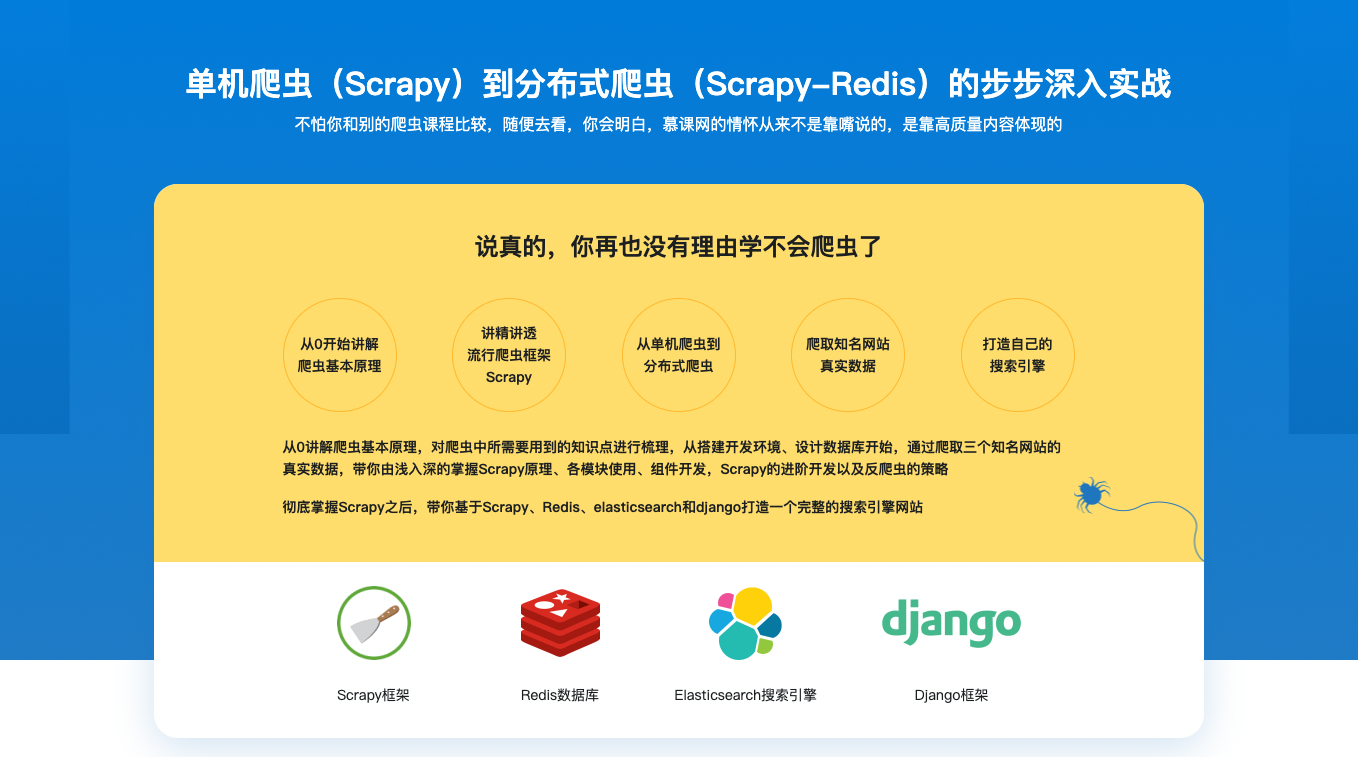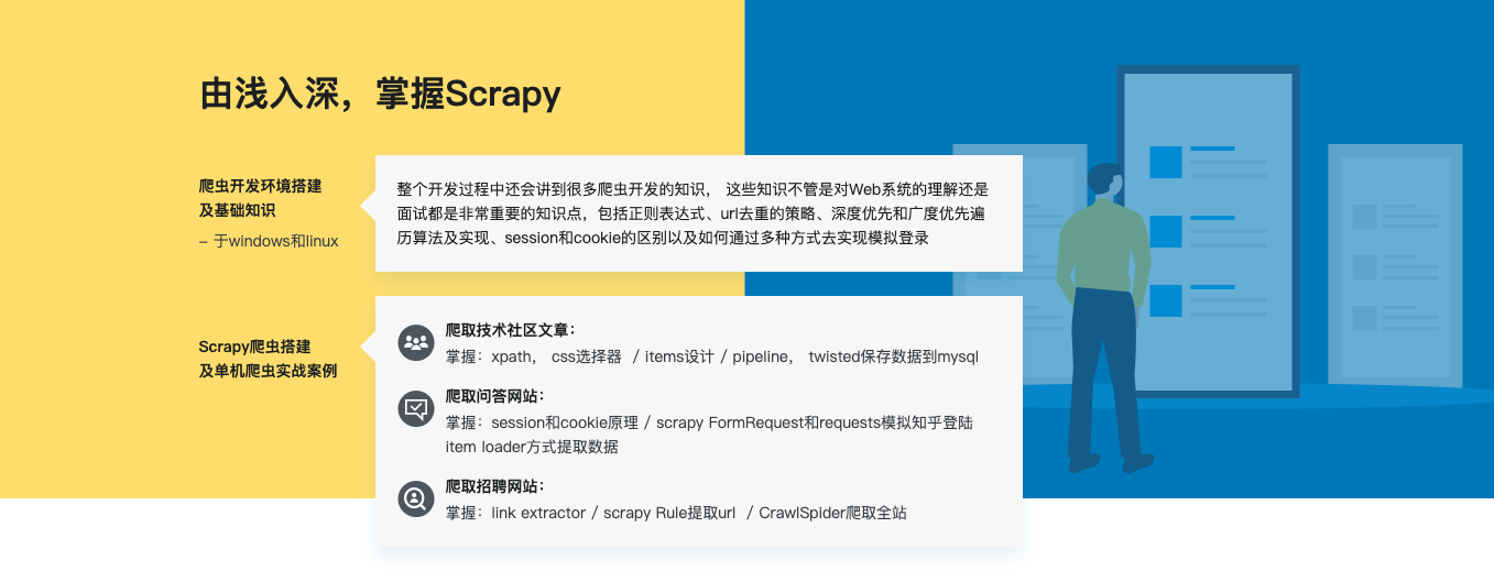 搭建scrapy的开发环境,本章介绍scrapy的常用命令以及工程目录结构分析,本章中也会详细的讲解xpath和css选择器的使用。然后通过scrapy提供的spider完成所有文章的爬取。然后详细讲解item以及item loader方式完成具体字段的提取后使用scrapy提供的pipeline分别将数据保存到json文件以及mysql数据库中。