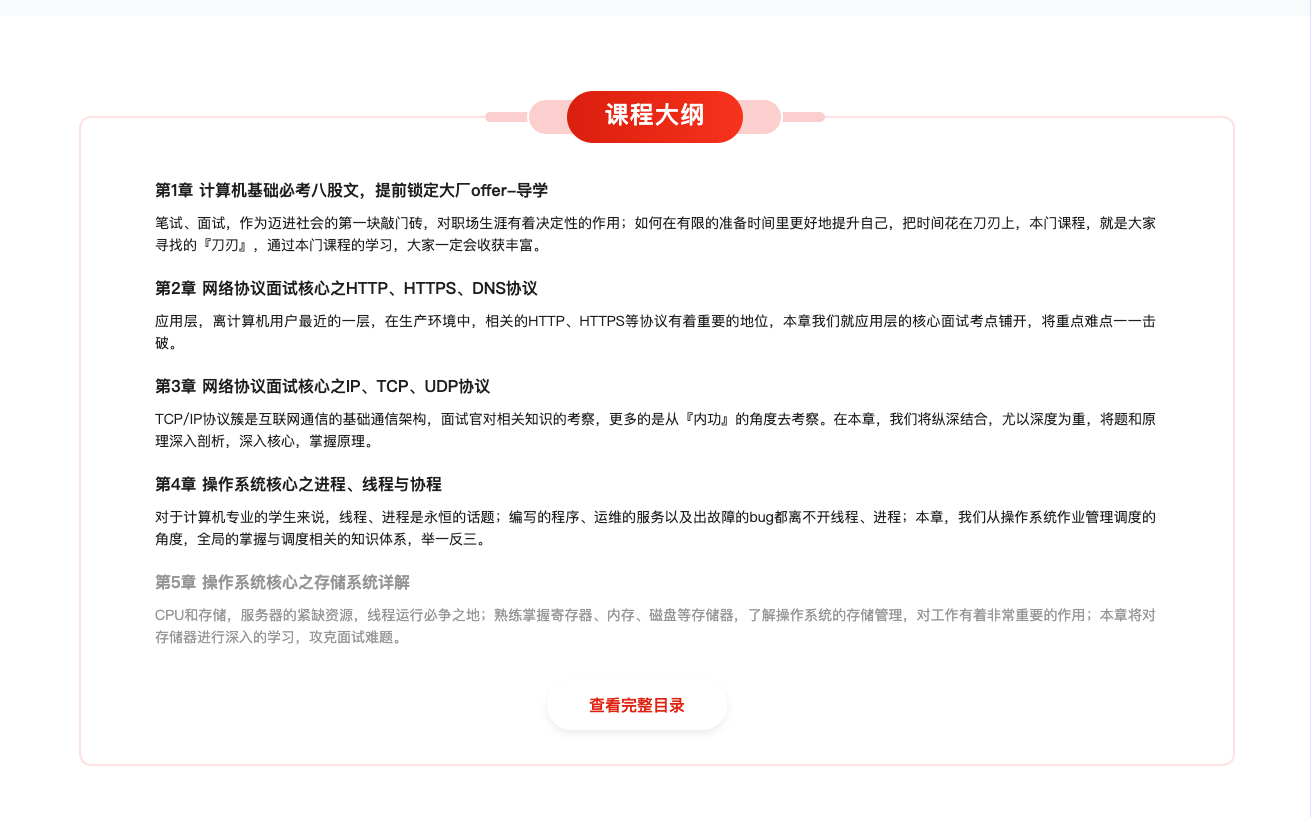 7天快速学习计算机基础必考八股文,本课程来自某课网官网售价268元,是一门后端校招面试的视频教程,本视频教程带你一起从计算机网络、操作系统、计算机原理、算法与数据结构、设计模式、数据库等经典基础知识,到初次求职的软技能,快速提升大厂重视的后端素养,斩获心仪校招offer。