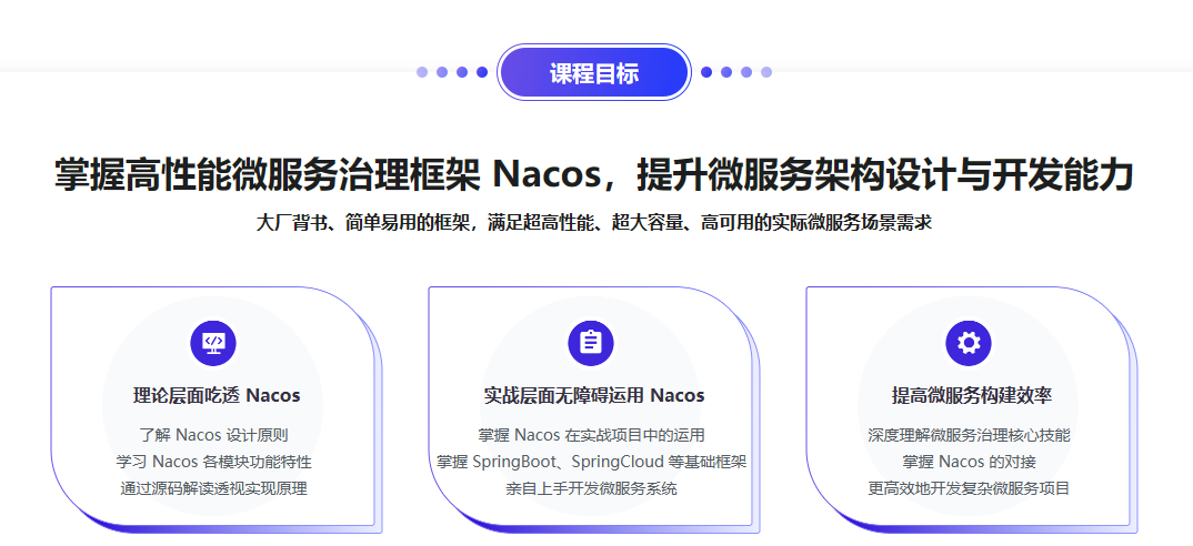 本课程从系统层面深入分析 Nacos 的设计及实现原理,并结合 SpringBoot、SpringCloud、Vue等技术实战开发微服务项目,让你更深入地理解 Nacos,在实战中掌握 Nacos 核心技术与应用。
