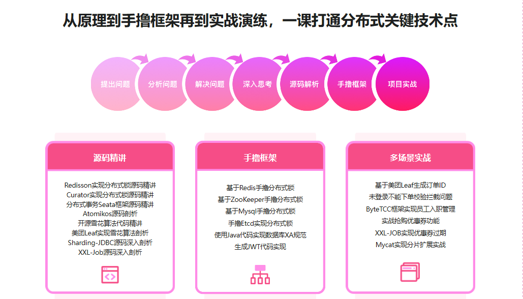 随着互联网数据井喷式的发展,分布式技术应运而生。分布式因其高性能、高可用、高扩展的特点,成为微服务项目的基石。本课程针对分布式六大主流问题进行多方案对比解析,多场景实战讲解,让你深度掌握分布式原理和实战。课程分别从源码、手撸框架、实战演练等多个方面进行多维度深入讲解,让你轻松掌握分布式各种解决方案,掌握分布式解决方案的设计和架构能力,跻身分布式高手行列。
