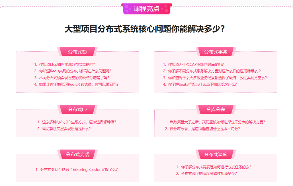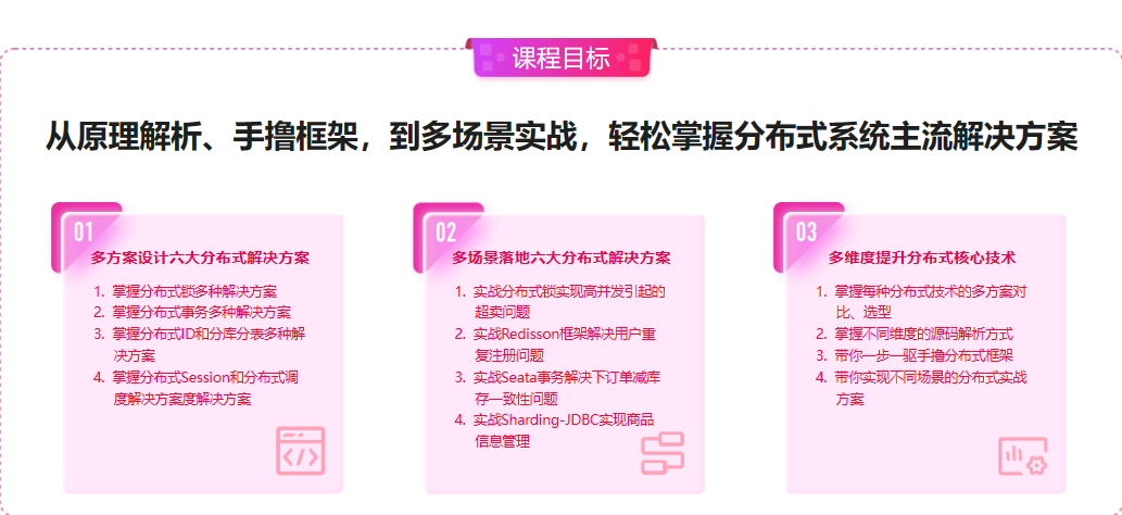 随着互联网数据井喷式的发展,分布式技术应运而生。分布式因其高性能、高可用、高扩展的特点,成为微服务项目的基石。本课程针对分布式六大主流问题进行多方案对比解析,多场景实战讲解,让你深度掌握分布式原理和实战。课程分别从源码、手撸框架、实战演练等多个方面进行多维度深入讲解,让你轻松掌握分布式各种解决方案,掌握分布式解决方案的设计和架构能力,跻身分布式高手行列。