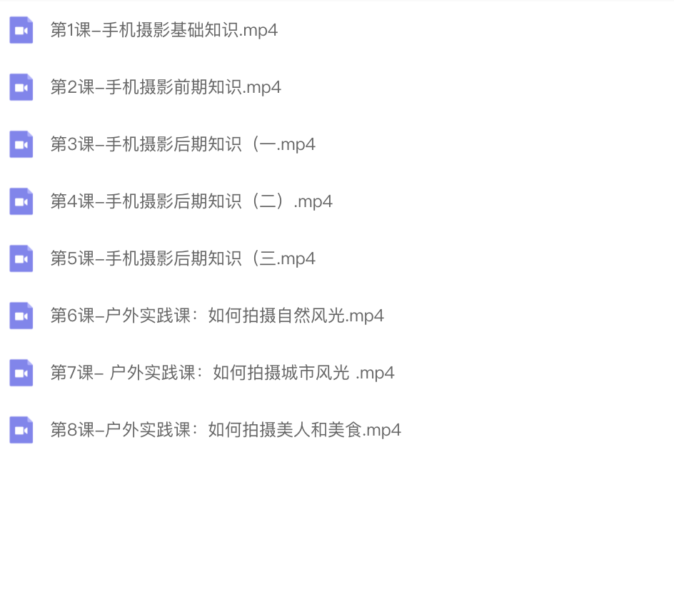 8节视频大课,室内讲理论,室外搞实践。用团队最熟悉的录屏方式讲解系统的后期流程。搭配字幕、专业的同期收声;灯光师往死里照的布阵、豪华双机位、流畅自然的剪辑,还有精心设计的段子+浑然天成的笑点(不笑并不能退钱)。很多小伙伴都表示get到实用的手机摄影技巧,这套干货满满,经过长时间打磨、准备、录制的课程!不要再因为拍照渣而归咎于你的手机了,也不要再给借口自己没有摄影天赋。大神手把手用通俗易懂、简单易get的理论搭配实践,系统性地帮你搞清楚学习要点,让你不再背上“拍摄渣”的名号,不用再遭受小伙伴的吐槽。0基础也能学的课程。你要准备的,只需要一台正在你手上握着的手机。学完本次课程,你一定能get懂前期手机摄影技巧,以及后期对于照片的加工处理。告别“崩照”,告别做一个不会拍照的男/女朋友,刷爆朋友圈的神技从这里打开。