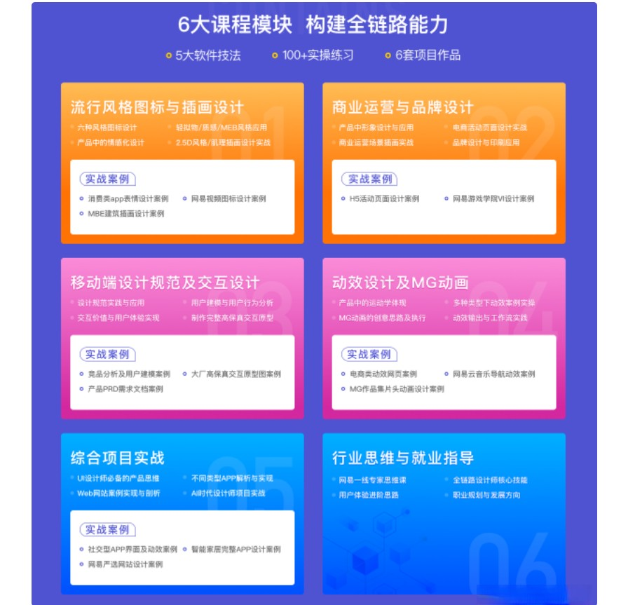 【课程特色】通过6大课程模块,6大软件技法,100+实操练习,6套项目作品,带你打通全链路,成为独当一面的企业核心设计师。