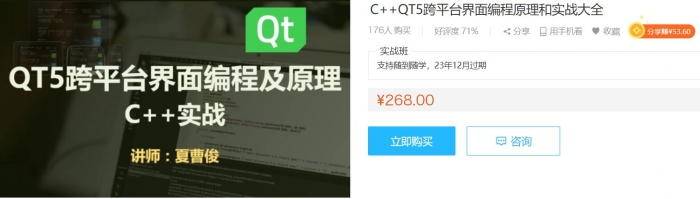 本套课程C++ QT5 跨平台界面编程原理和实战大全,学习本套课程之前需学过c++或者其他的面向对象编程语言;学完本课程能够掌握QT开发环境配置方式,理解QT的信号槽机制,理解QT的界面、资源、信号槽源码的生成方式,学会使用qss样式表来设置界面,能够投入实战,能做基于QT跨平台功能强大的界面程序。