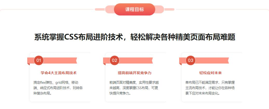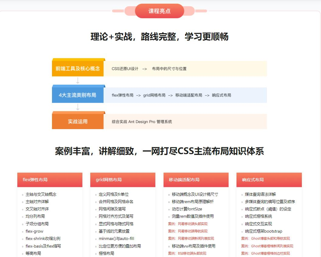 实现精美页面是前端工程师的核心能力之一,CSS布局技术是实现精美页面的核心技术,但CSS布局好入门,难精通。本课将围绕前端4大主流布局,通过大量的实际案例,带你边学习,边实操,让你系统掌握CSS布局进阶技术,轻松解决各种精美页面布局难题。