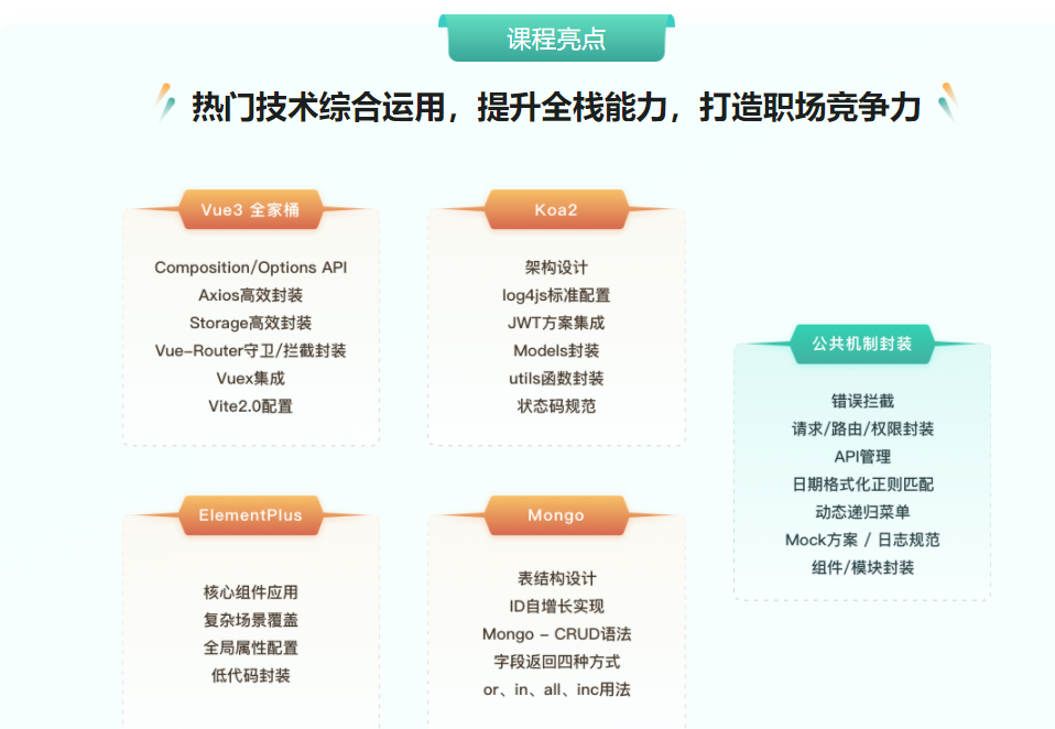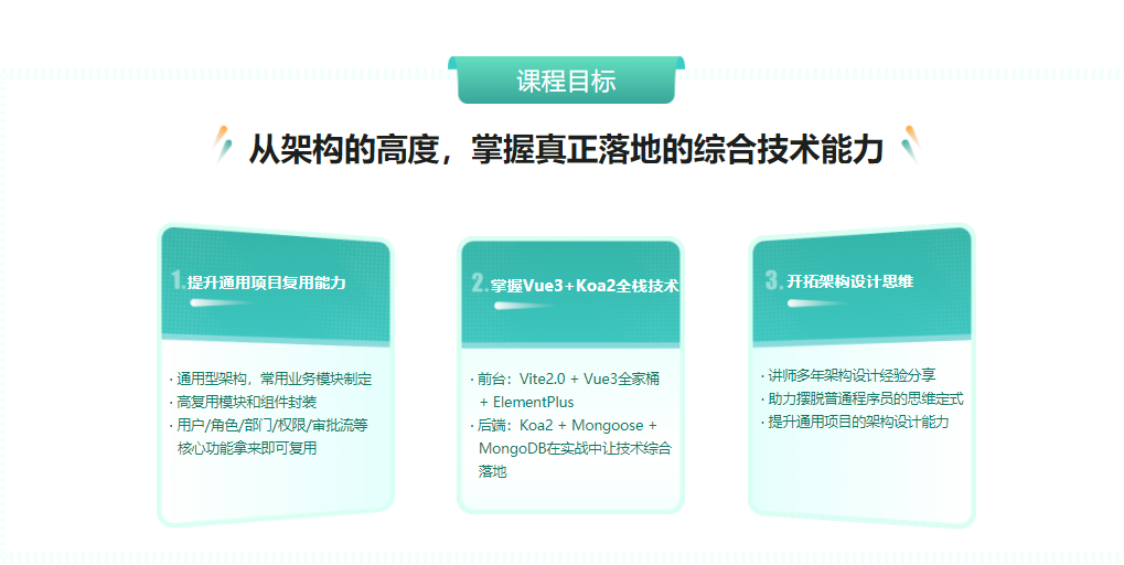 现如今前端的边界在持续扩大,企业对于工具化、平台化、全栈化能力要求也越来越高。本课程将应用Vite2.0 + Vue3 + ElementPlus+Koa2+Mongo开发一个通用后台管理系统,带大家掌握全栈开发能力,及真正落地的综合技术能力。