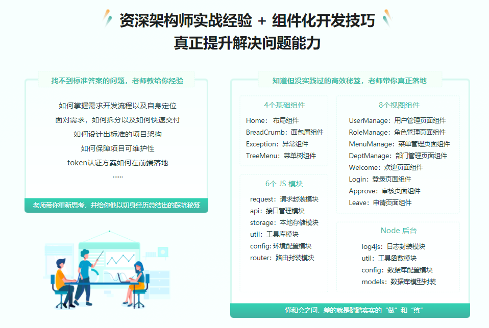 项目开发完成后,我们会重点讲解在人力短缺的工作中,如何提效,如何优化重构模块,我们会重点开发脚手架和低代码组件来实现降本增效。