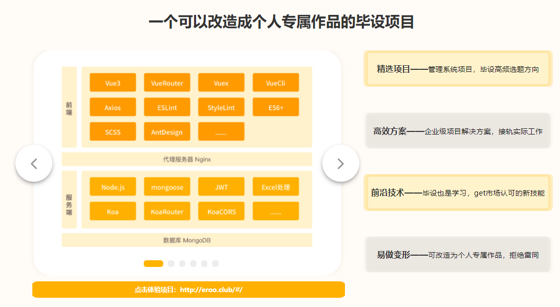 专为毕业生打造,助你高效、高质量完成毕设作品,解决毕业头等大事。课程全面梳理毕设流程,并精准定位每个环节的重点难点、完成技巧,扫清毕设难题。采用主流、企业级技术栈,祝你完成毕设,直面校招。