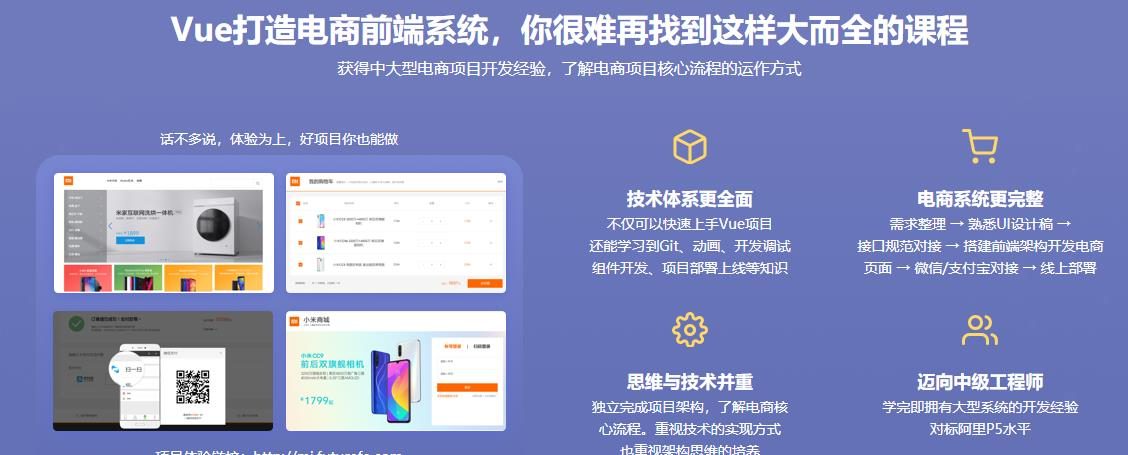 课程以Vue全家桶作为主要的技术体系,模拟小米商城,从0开始开发网页和交互功能。你学习丰富的技术栈和各类组件知识,还能了解Git、动画、开发调试等方面的知识。同时项目本身具有很强的实用性,稍作修改,便能“为我所用”。