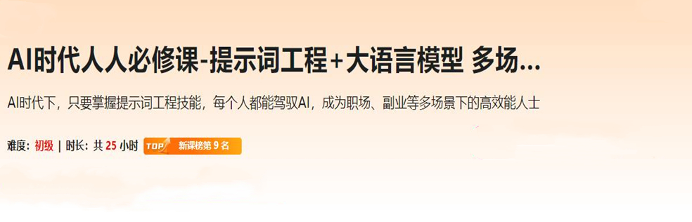 AI时代下,只要掌握提示词工程技能,每个人都能驾驭AI,实现大幅提升工作效能和质量,拓宽职业发展,获得更多的机会和优势。本课为你提供一套实用的、系统的提示词工程基础、原则、应用场景和实践方法。带你从提示词工程的市场需求和职业发展出发,逐步深入并融合大模型提升商业化思维,打通职场、副业的求职、创作、教学、绘图、编程等多场景应用实战,轻松驾驭AI,大幅提升你的效能和质量。