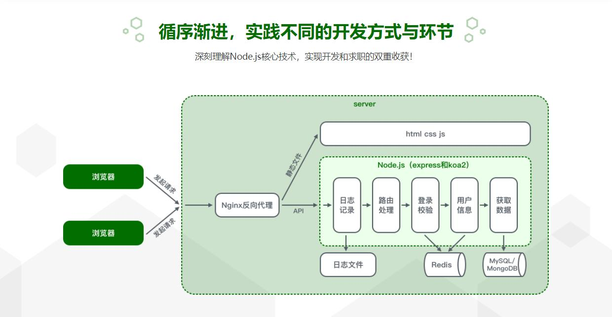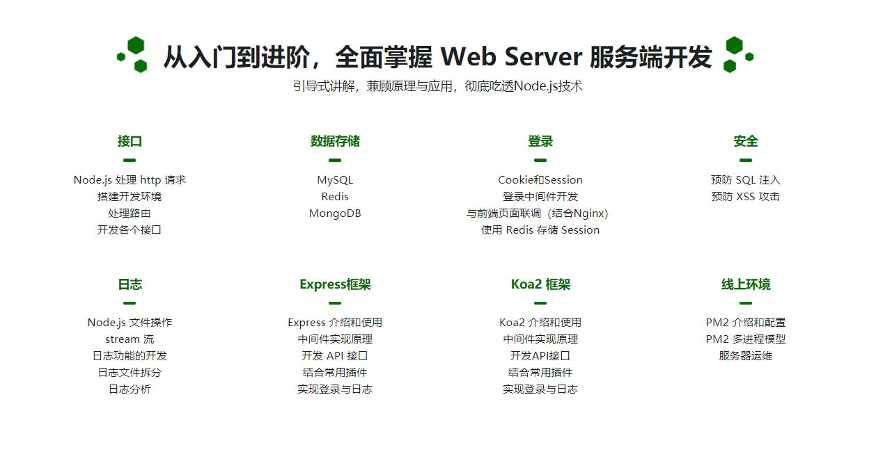 前端开发人员必备技能Node.js提升课程。本课程以博客项目为主线,由浅入深讲解 Node.js 基础知识、框架和插件原理、web Server 的特点与必备模块,在项目开发过程中全面掌握Node.js。掌握全栈工程师必备技能!