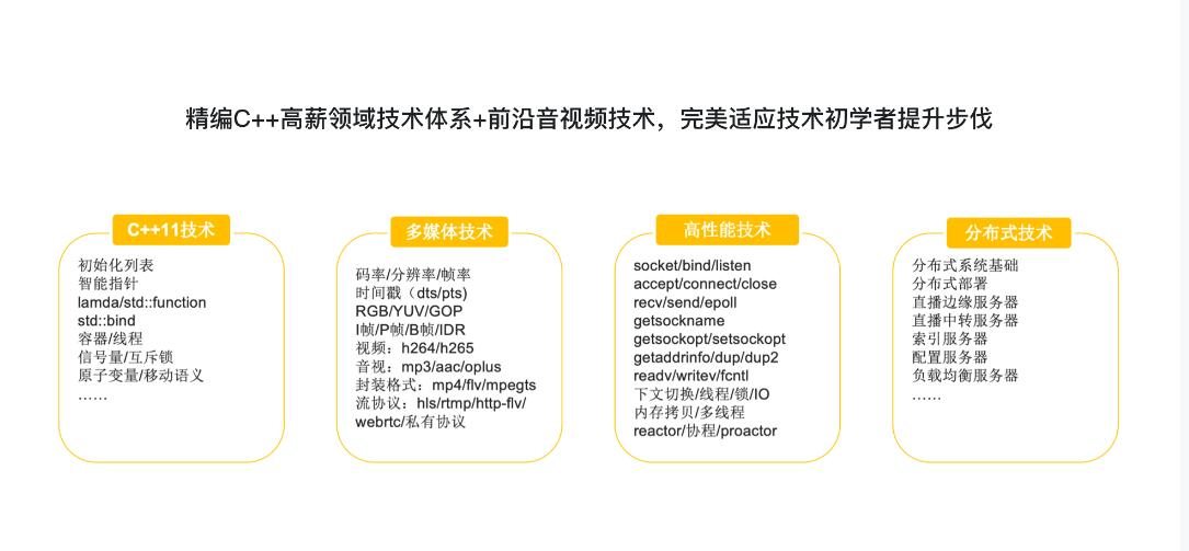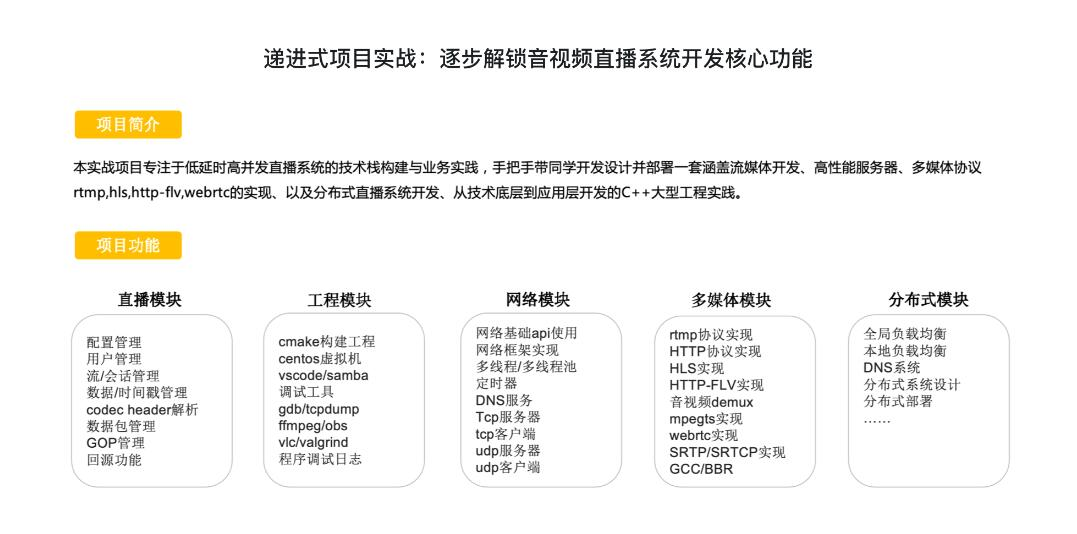 当下火爆的短视频,直播,实时音视频传输都需要高性能直播系统的支撑,行业薪资水涨船高,本课程特邀前字节直播业务核心开发工程师,通过深入浅出的教学方法,带同学全面掌握从底层技术到应用层实现的直播系统开发技能。完成本课程将成为具备千万级并发处理能力的音视频直播系统工程师,能够设计、开发并部署高效稳定的直播解决方案,同时全面升级你的C++技能树,为职业生涯开辟更多可能性。