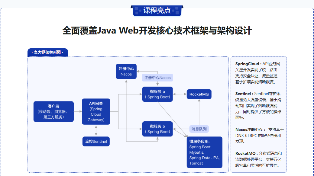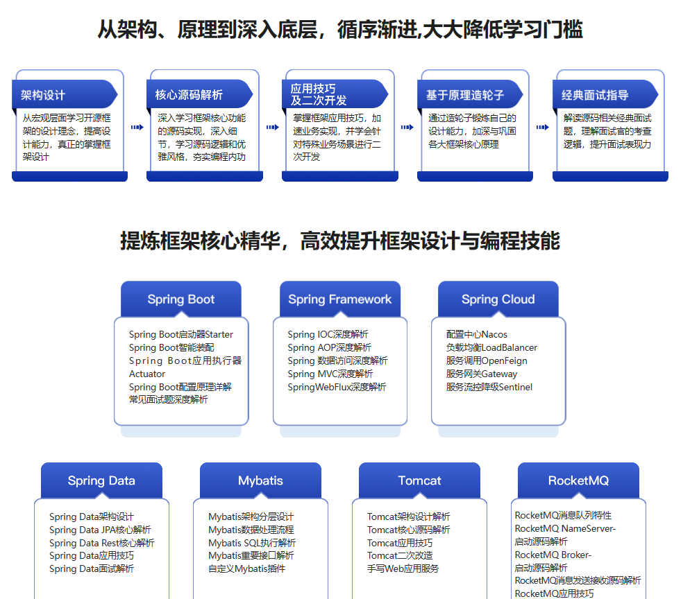 提升编程水平的最佳方式就是多阅读优秀的框架源码。本课程专门为你汇聚了Java Web开发主流热门框架(Spring Framework , Spring Data, Spring Boot, Spring Cloud,Mybatis,Tomcat,RocketMQ),从框架的架构设计、核心源码解析 到二次开发,造轮子,面试指导,循序渐进的让你更全面的掌握框架底层原理,提升框架应用技巧、和造轮子等高阶能力。