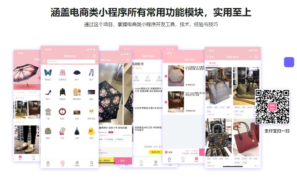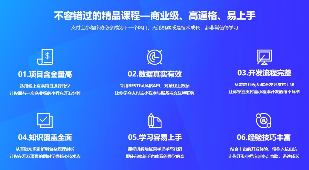 课程选用线上真实项目,带你积累商业级小程序开发经验;同时采用RESTful风格API,对接线上数据,突破小程序与服务端交互难题。从基础知识讲解到原理剖析,在开发的同时学懂核心技术点;课中结合老师丰富的开发经验,让你少走弯路,迅速成长。