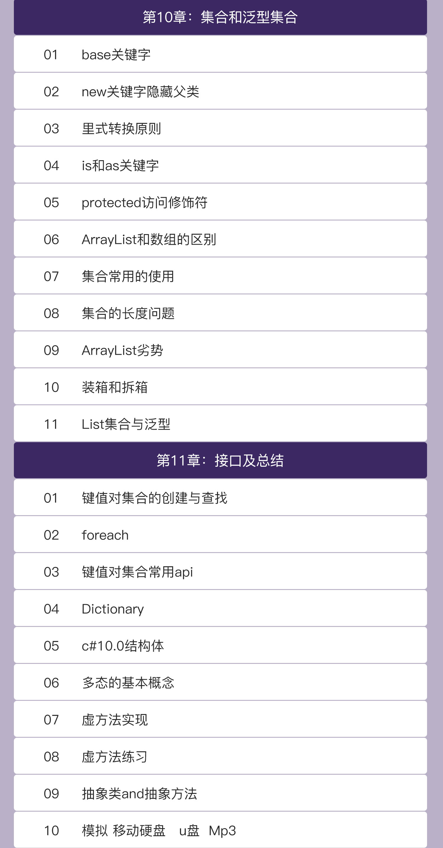 这是一门适合初学者的C#入门课程。通过易于理解的语言和丰富多彩的例子,详细介绍了使用C#开发Windows应用程序的技术。本课程共169节。从C#语言的基本知识入手,逐步介绍了C#语言的各个方面,包括变量、数据类型、控制句、数组、函数、类别、继承、接口、异常处理等