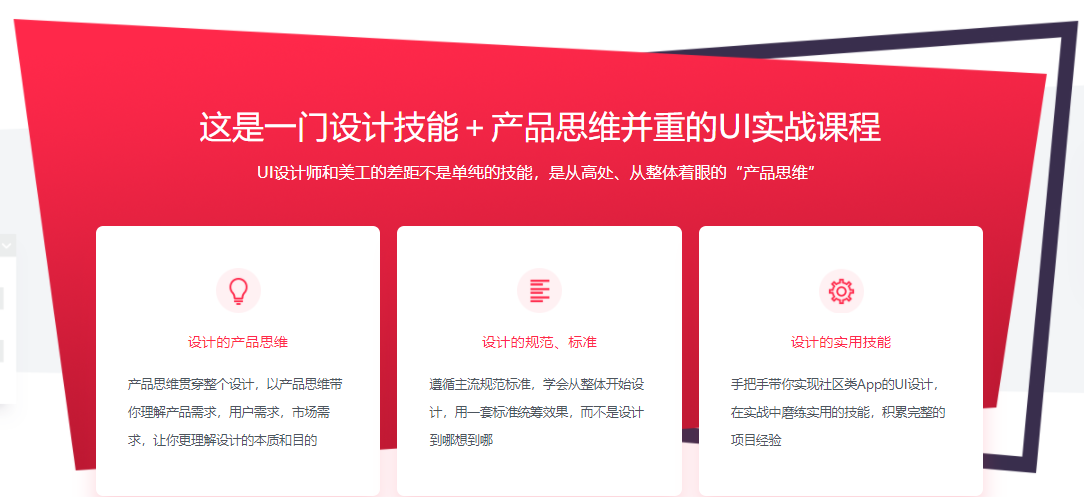 不同于其它只教给你规划技艺的课程,本课程将带你从产品的高度实战UI规划,以产品需求为导向,按真实项目流程停止实战,遵循干流的规划标准与标准,一步步完结APP规划,让你真实成为一个具有产品经理思维的“规划师”。